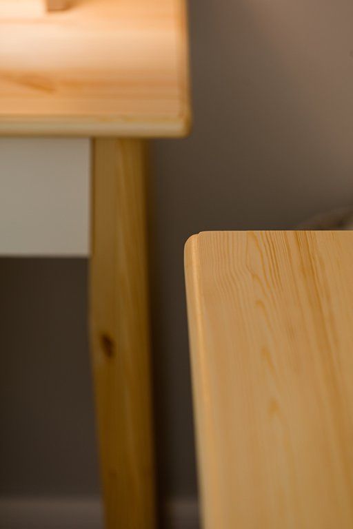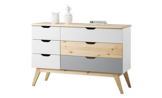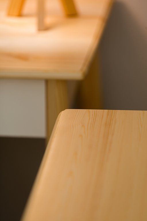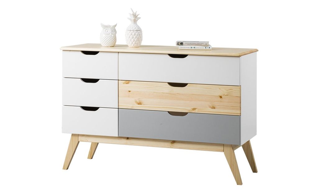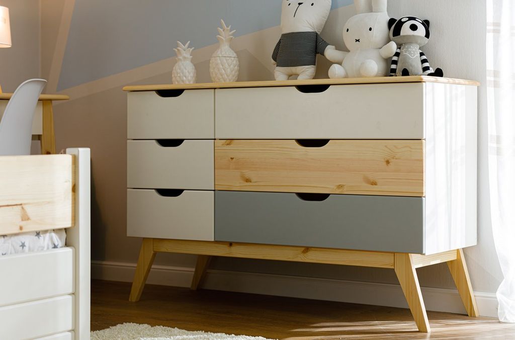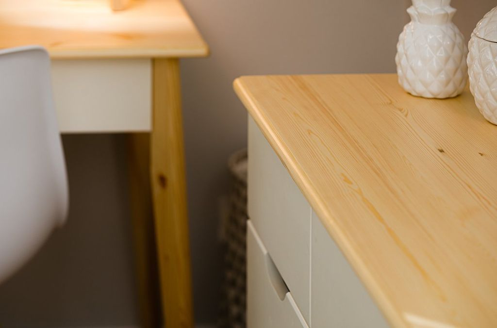 Можно выбрать любые варианты тонировок массива сосны. Цвет комода на титульной фотографии - эмаль белая/бесцветный лак - крышка, ножки, большой средний фасад/серый-большой нижний фасад. Стоимость зависит от выбранного покрытия. При заказе мебели в составном цвете цена считается по более дорогому (в данном примере по цвету "серый" 3 категория).