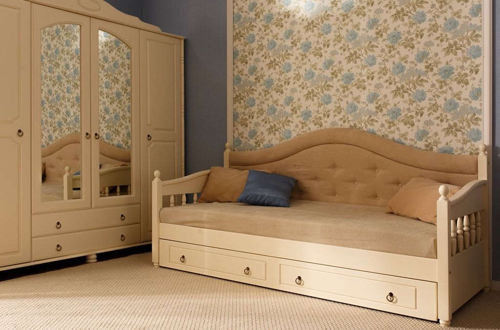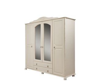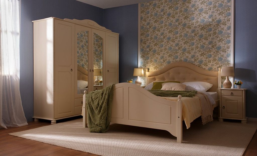 Можно выбрать любые варианты тонировок массива сосны. Возможны комбинированные цвета. На фото эмаль слоновая кость - 2 категория. Стоимость зависит от выбранного покрытия. При заказе мебели в составном цвете цена считается по более дорогому. Резные накладки красят в цвет боковин.