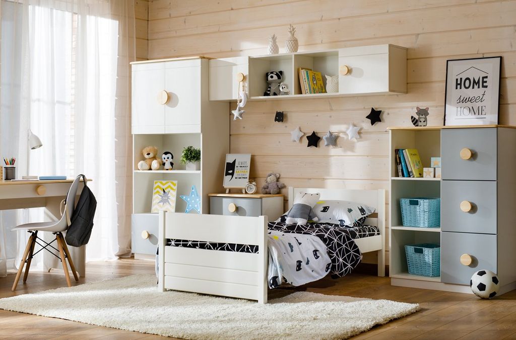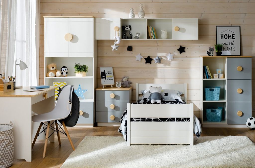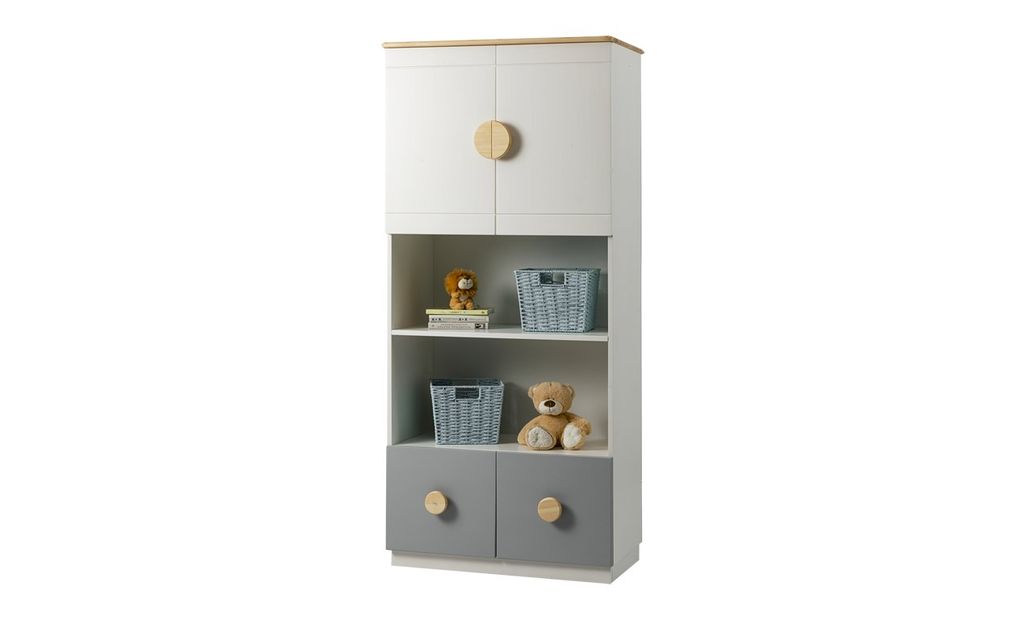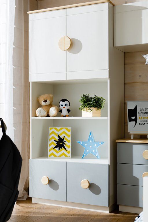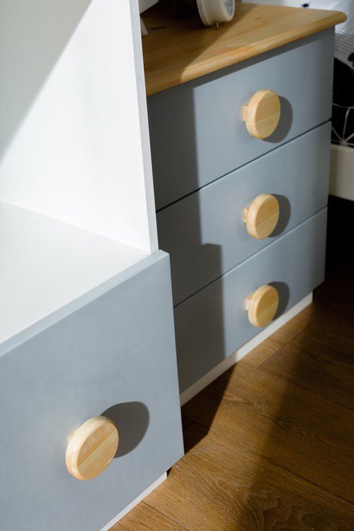 Цвет стеллажа на титульной фотографии - эмаль белая/бесцветный лак - крышка, ручки/серый - фасады ящиков. Стоимость зависит от выбранного покрытия. При заказе мебели в составном цвете цена считается по более дорогому, в данном примере по цвету "серый".
