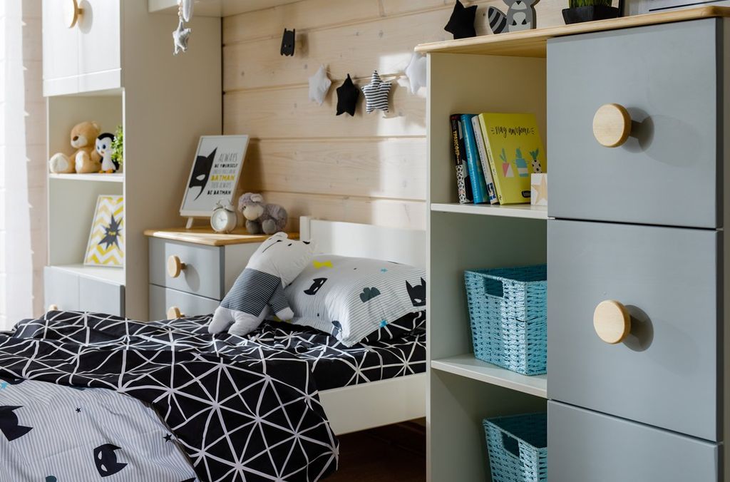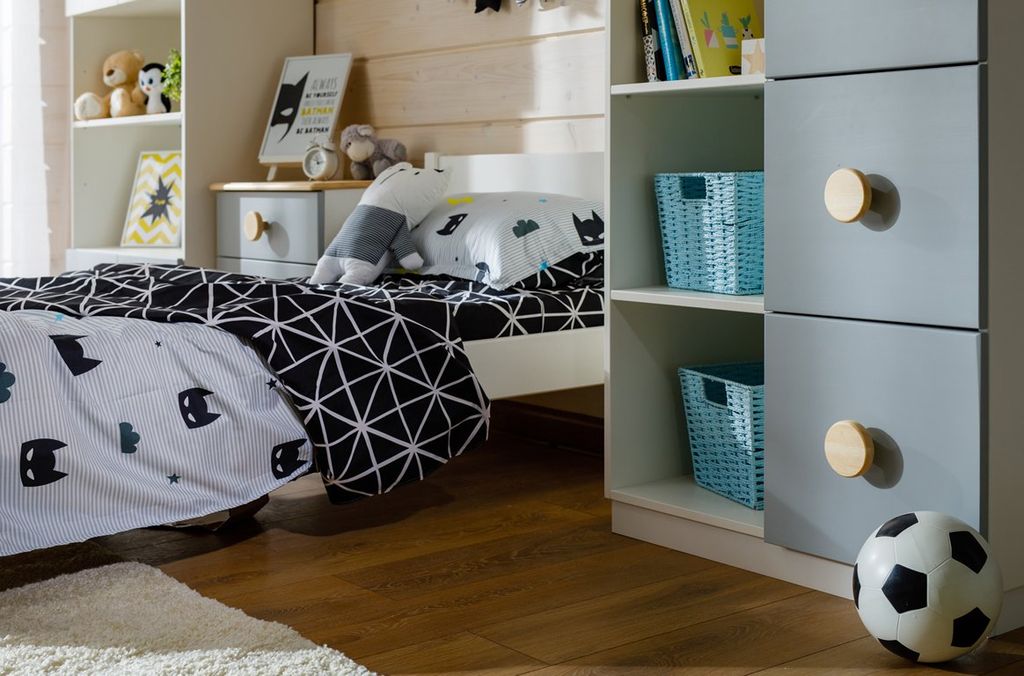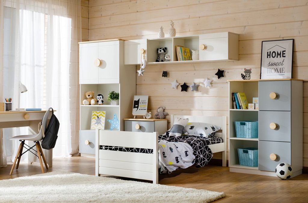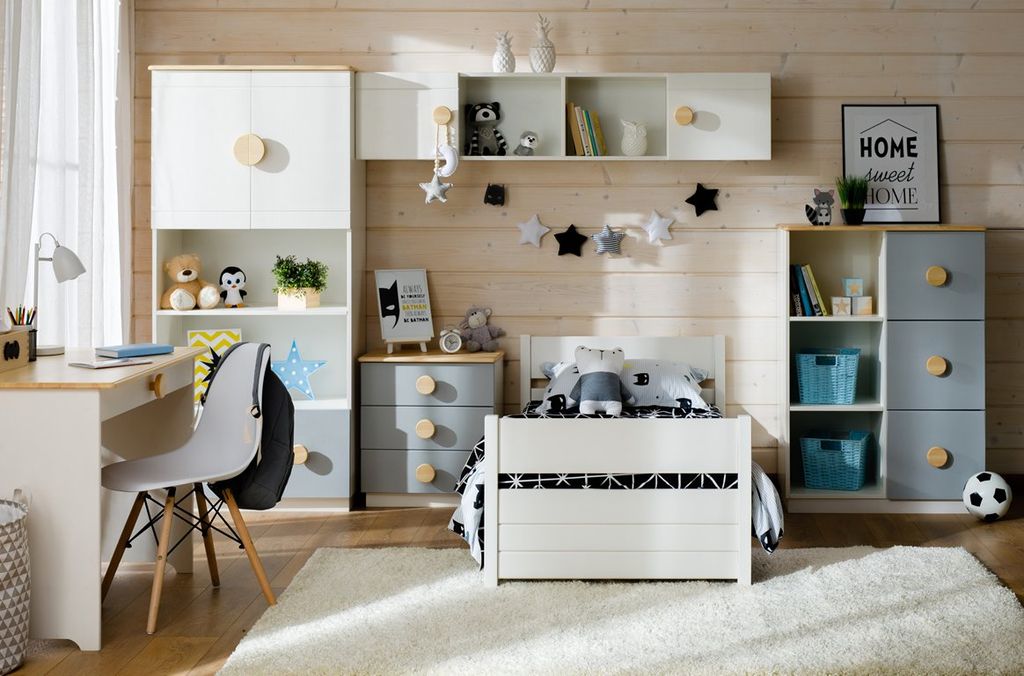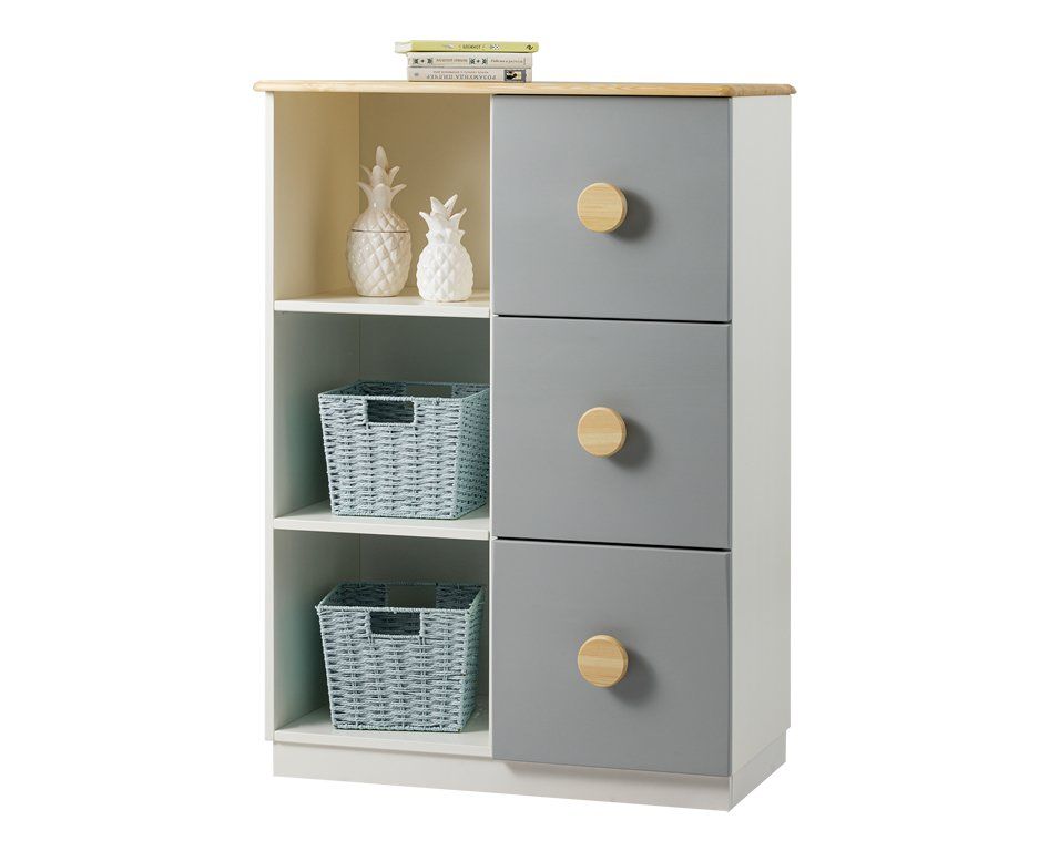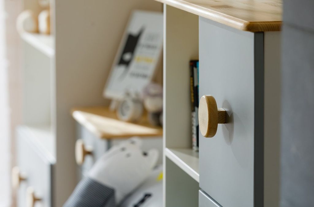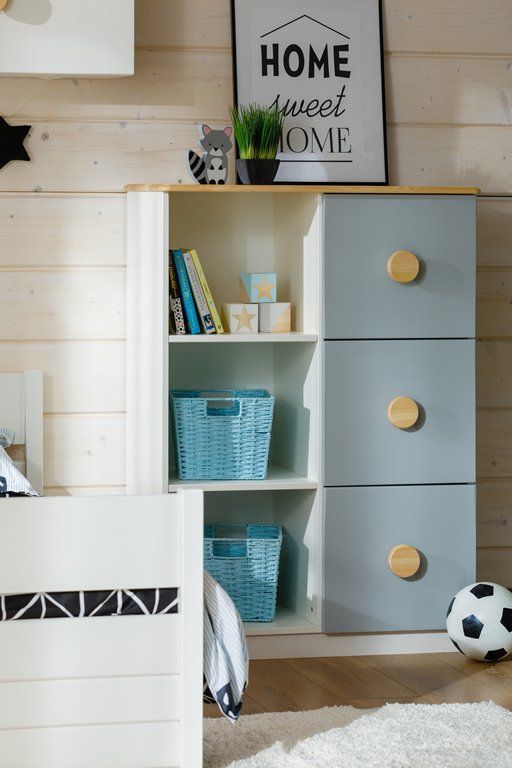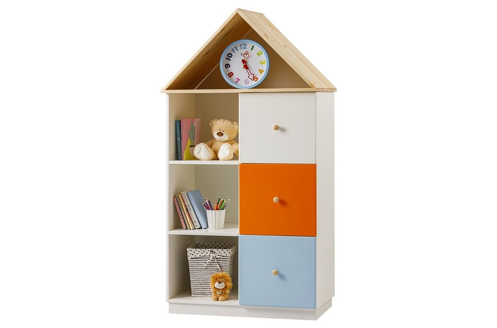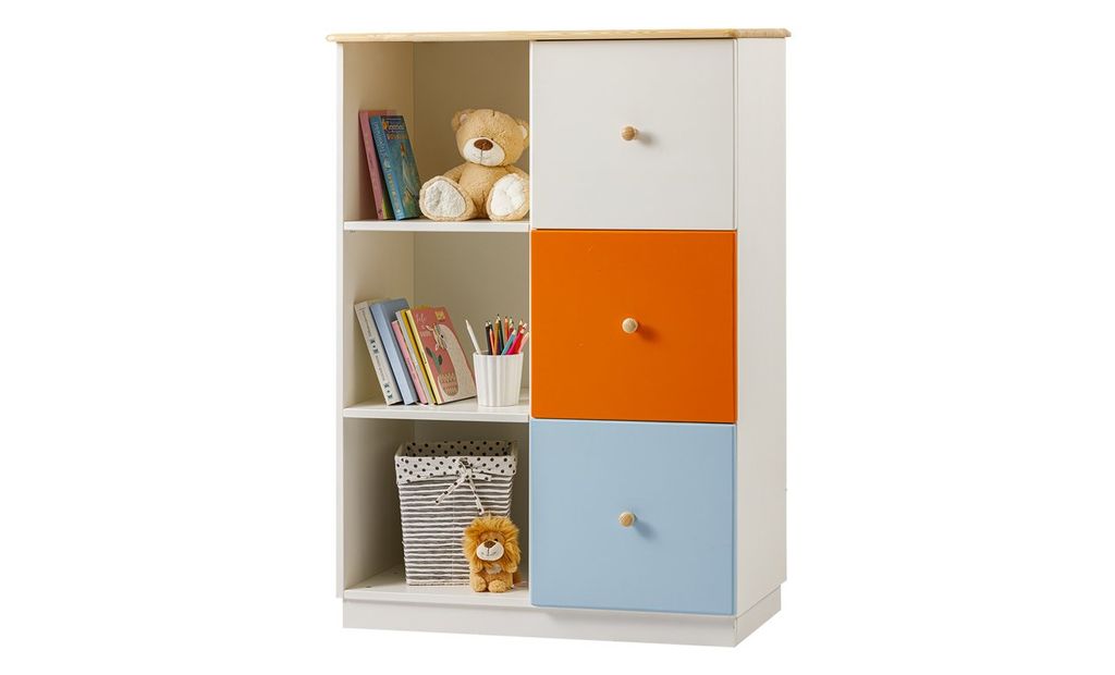 Цвет стеллажа на титульной фотографии - эмаль белая/бесцветный лак - крышка, ручки/голубая кидс - нижний фасад/оранж - средний фасад. Стоимость зависит от выбранного покрытия. При заказе мебели в составном цвете цена считается по более дорогому, в данном примере по цвету оранж или голубая кидс.