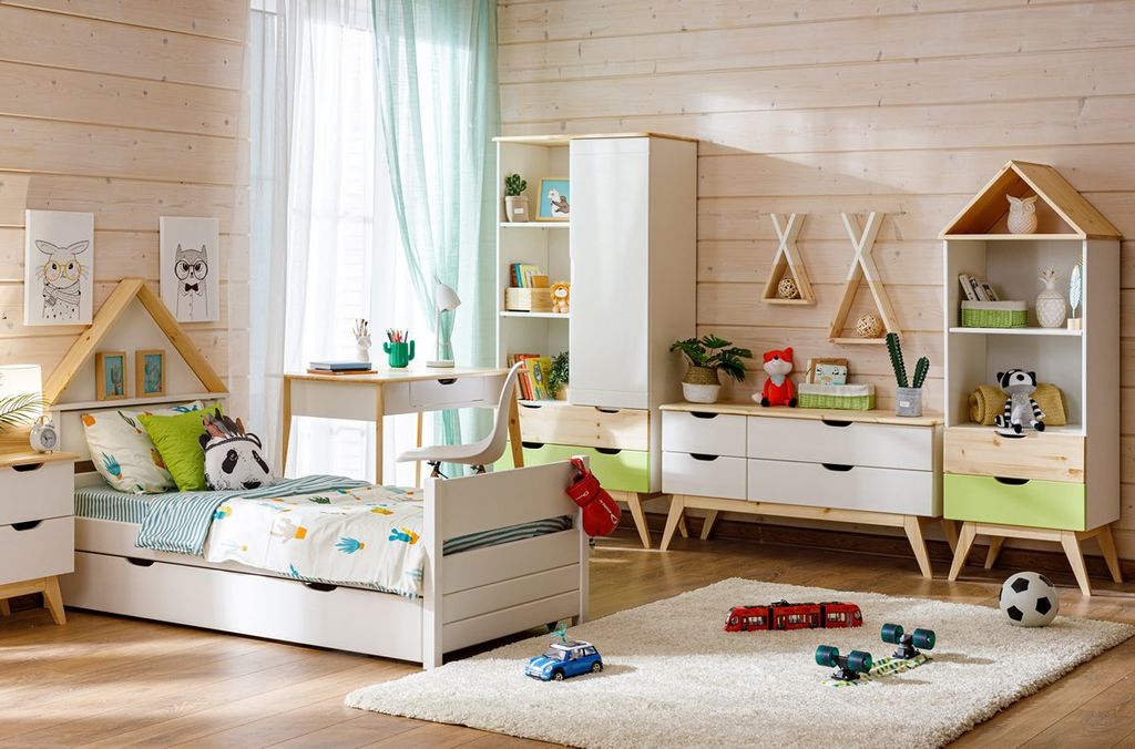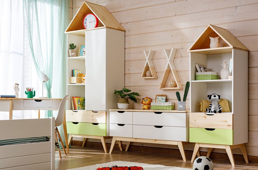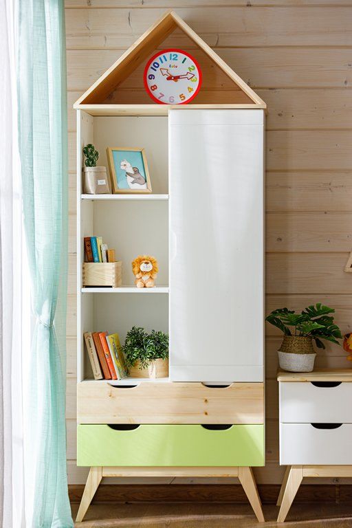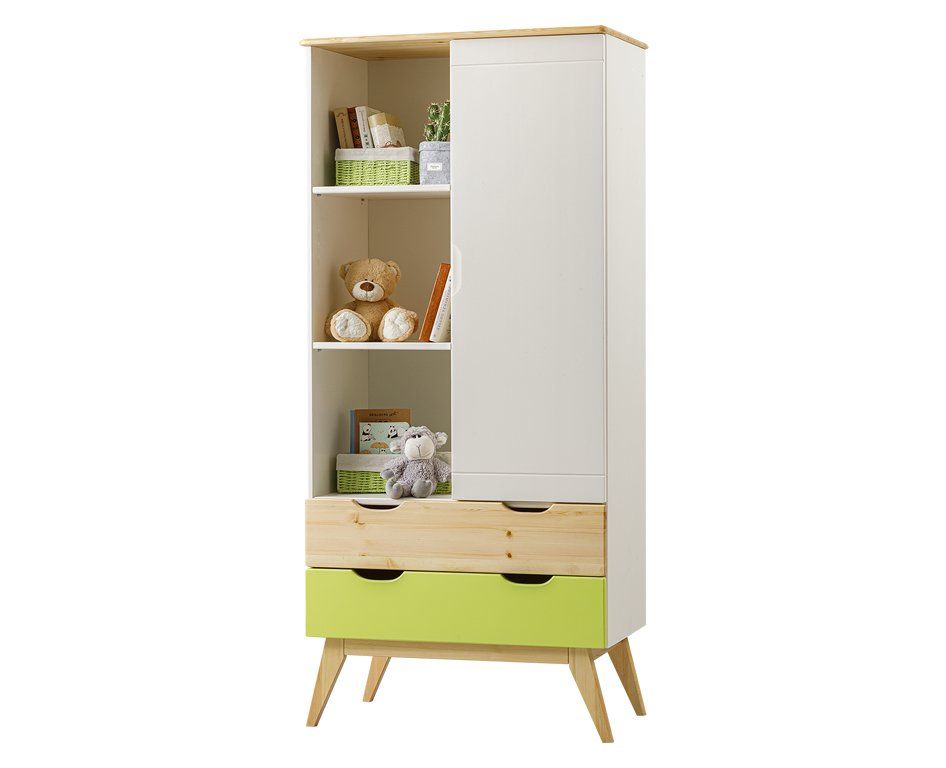 Цвет стеллажа на титульной фотографии - эмаль белая/бесцветный лак - крышка, ножки, фасад верхнего ящика/лайм кидс - фасад нижнего ящика. Стоимость зависит от выбранного покрытия. При заказе мебели в составном цвете цена считается по более дорогому, в данном примере по цвету "лайм кидс".